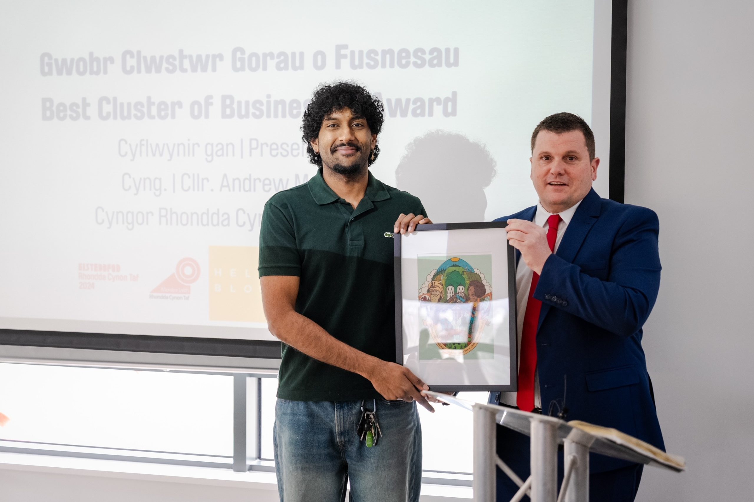 Gwobr clwstwr o fusnesau: cyfle i wobrwyo clwstwr o fusnesau sy’n cydweithio neu sydd ar un safle a ddangosodd gefnogaeth i’r Eisteddfod a’r Gymraeg. Cyflwynwyd gan y Cyng. Andrew Morgan, Cyngor Rhondda Cynon Taf.